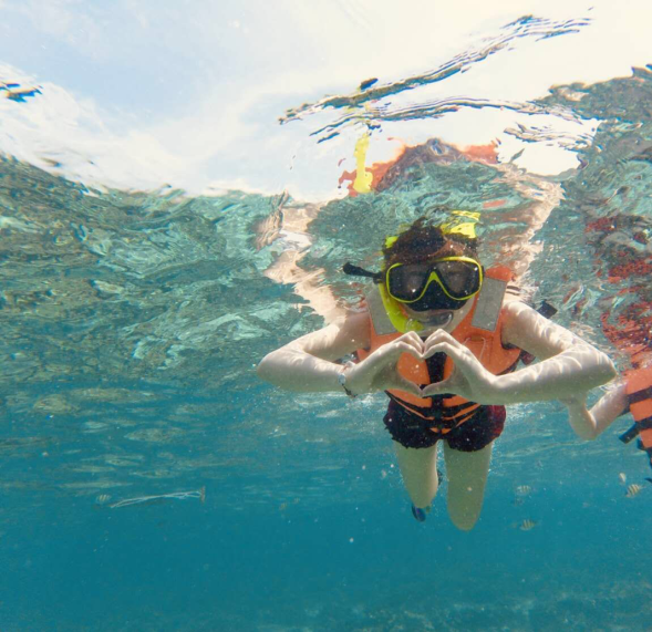 潛水是一次特別的體驗,剛開始下水的時候,我真的特別害怕,后來我努力克服在水下用嘴巴換氣的困難,很快我學會了潛水,透過潛水眼睛我看到了美麗的海星,五彩斑斕的魚兒出沒在招搖的珊瑚礁中,我徹底沉浸在涼爽清透的海水中,我感到自己與自然融為了一體。