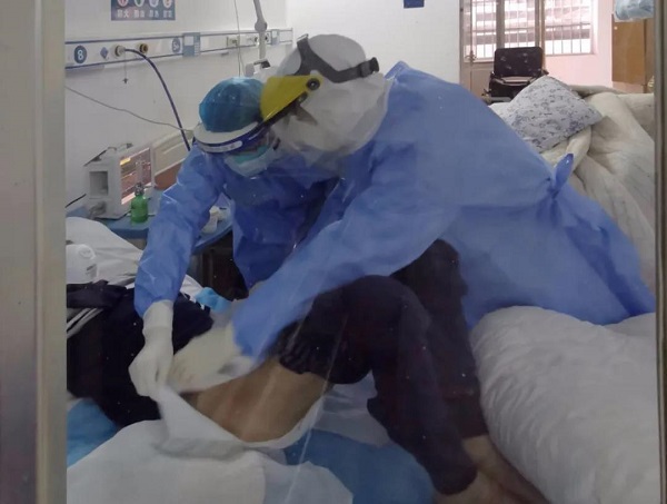 這位患者今年62歲,已經(jīng)病了好幾個月了,最初在鄉(xiāng)鎮(zhèn)衛(wèi)生院治療,后來檢測出來感染了新型冠狀病毒肺炎。縣醫(yī)院接管他的時候,病情已經(jīng)極其危重,大小便失禁,床上臊臭氣熏人,患者全身骨瘦如柴,動則喘氣,吃不下東西。